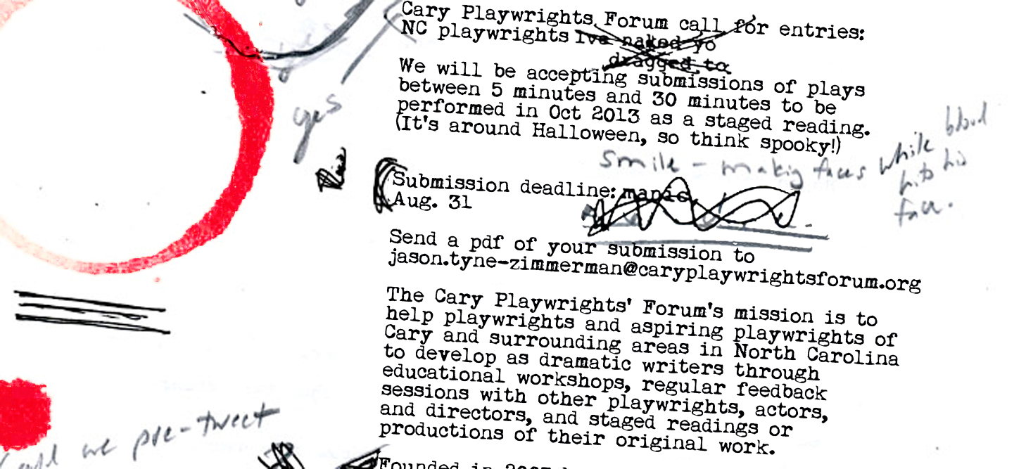 Cary Playwrights’ Forum will hold our October Staged Reading – “Close Encounters: Tales of Space, Ghosts & Blood!” at 7:30 pm on Friday, October 11th and Saturday, October 12th in the Paul Cooper Room at the Cary Arts Center. Free – Suggested Donation $10
